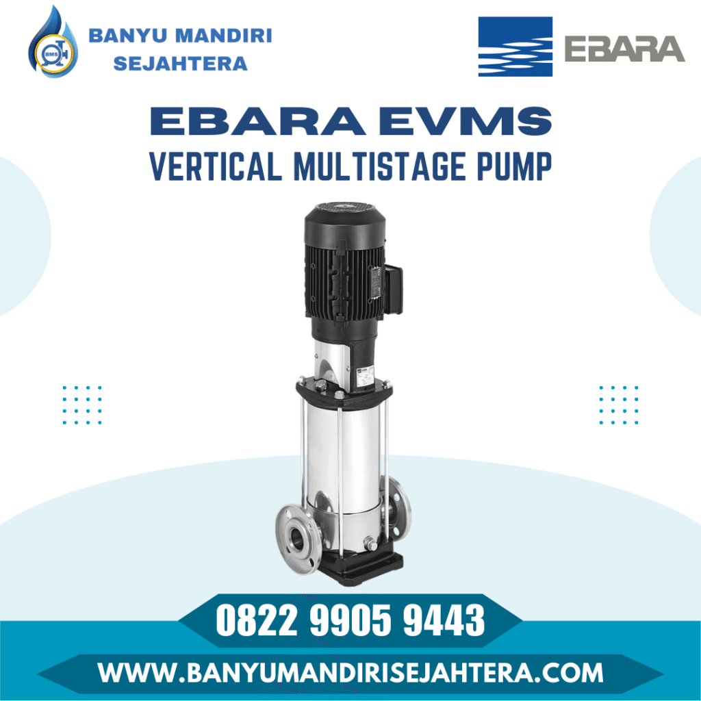 Ebara EVMS (Vertical Multistage Pump) Tipe ini sangat ideal untuk aplikasi tekanan tinggi di ruang terbatas. Ebara EVMS sering digunakan sebagai pompa RO (Reverse Osmosis) dan sistem booster karena desain vertikalnya yang hemat tempat.