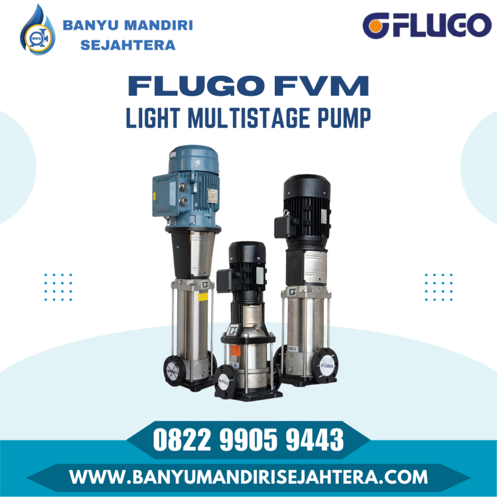 Flugo seri FVM (Vertical Multistage Pump) Bagi aplikasi yang membutuhkan tekanan tinggi namun memiliki keterbatasan ruang, tipe pompa Flugo vertikal ini adalah solusinya. Sering digunakan sebagai booster pump utama dan sistem pengisian boiler karena efisiensi tekanannya yang tinggi.