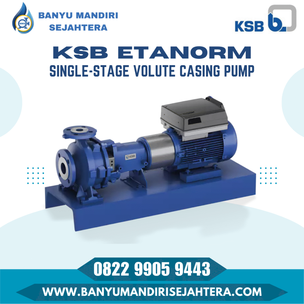 KSB Etanorm (End Suction Centrifugal Pump) Tipe ini adalah salah satu pompa sentrifugal yang paling sukses di dunia. KSB Etanorm dikenal karena standarisasi internasionalnya yang memudahkan penggantian dan perawatan. Sangat ideal untuk suplai air, sirkulasi pendingin, dan aplikasi industri umum.